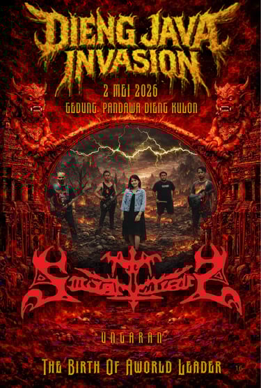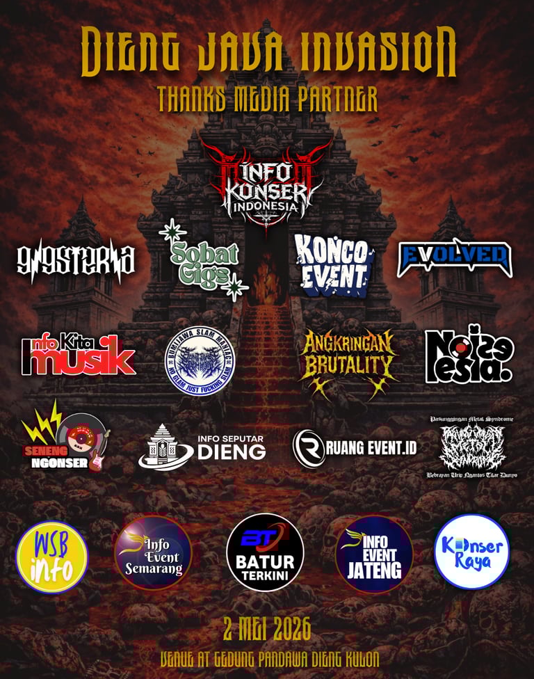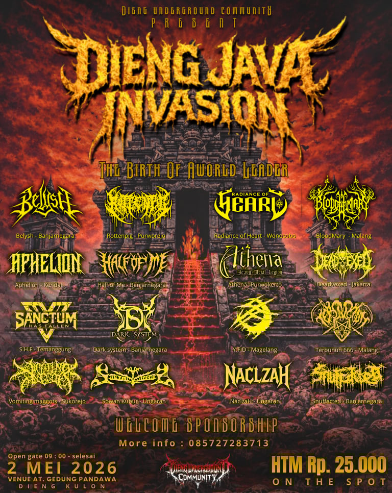 Dieng Java Invasion 2026 akan digelar di Dieng Kulon, Gedung Pandawa, sebagai salah satu festival musik metal paling dinanti di Dataran Tinggi Dieng. Acara ini akan berlangsung dengan Open Gate pukul 09.00 WIB hingga selesai, menghadirkan band-band metal terkenal dari luar Dieng yang siap mengguncang panggung dengan performa terbaik mereka. Dengan latar alam pegunungan dan atmosfer khas Dieng, Dieng Java Invasion 2026 bukan hanya sekadar konser musik, tetapi sebuah pengalaman festival yang memadukan musik keras, pariwisata, dan kebersamaan komunitas. Bersiaplah menjadi bagian dari sejarah, rasakan dentuman metal di atas awan, dan saksikan Dieng bergemuruh.
